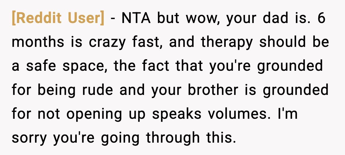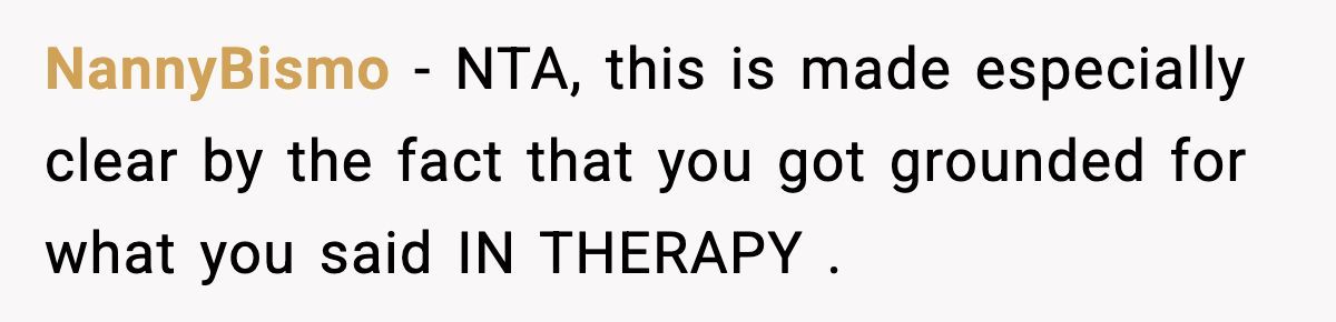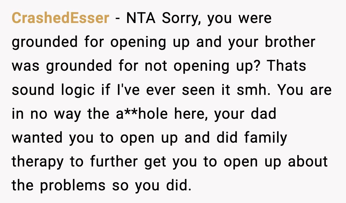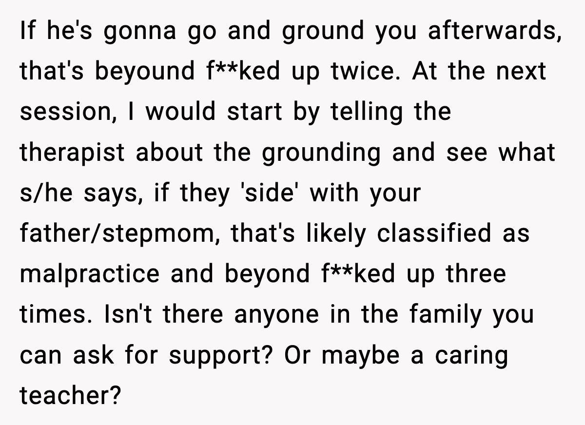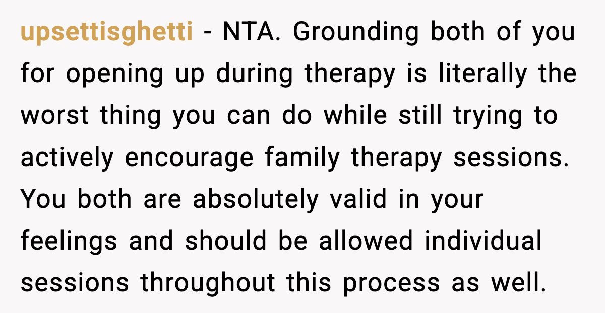 One user called the grounding for therapy honesty outrageous, siding with the teen