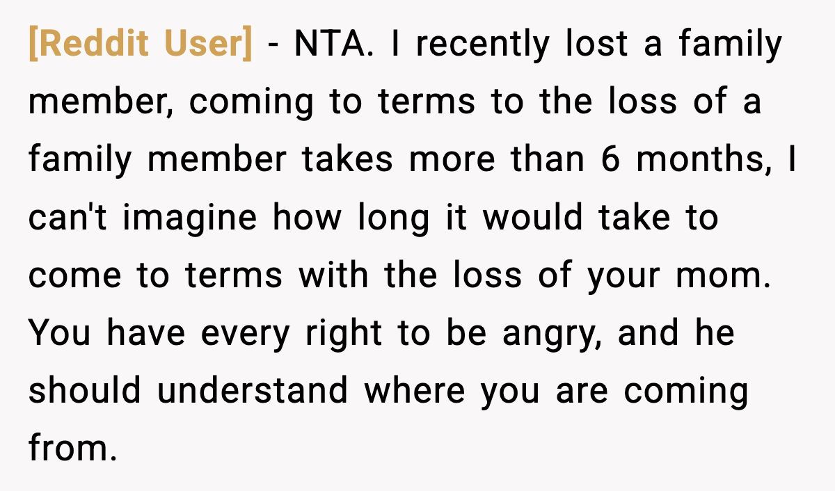 Another validated the teen’s anger, saying six months isn’t enough to grieve