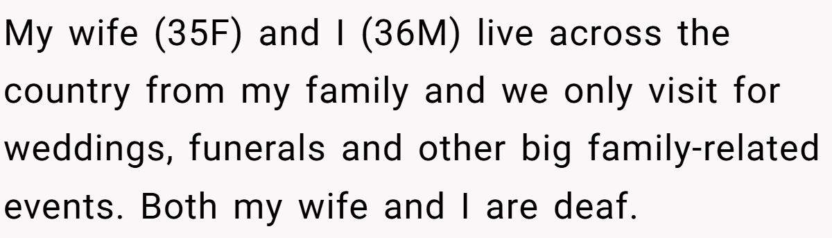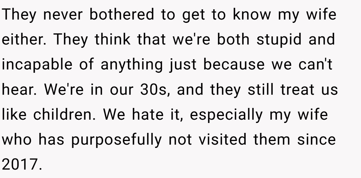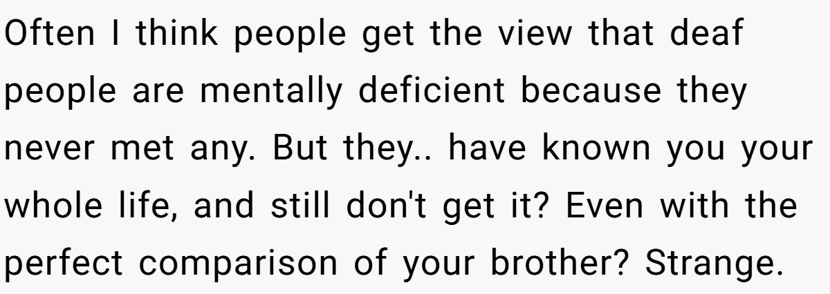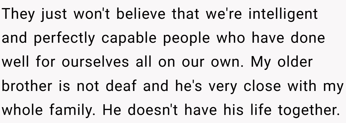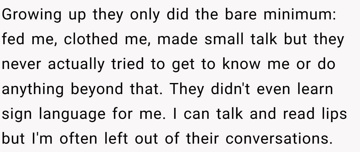 From the moment he was old enough to understand, the Redditor knew he was different, and that his family saw him that way, too. Born deaf, he grew up in a house where no one learned sign language beyond the barest basics.