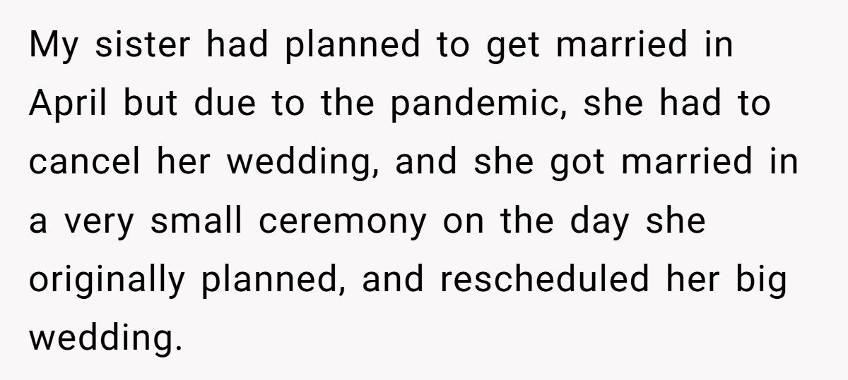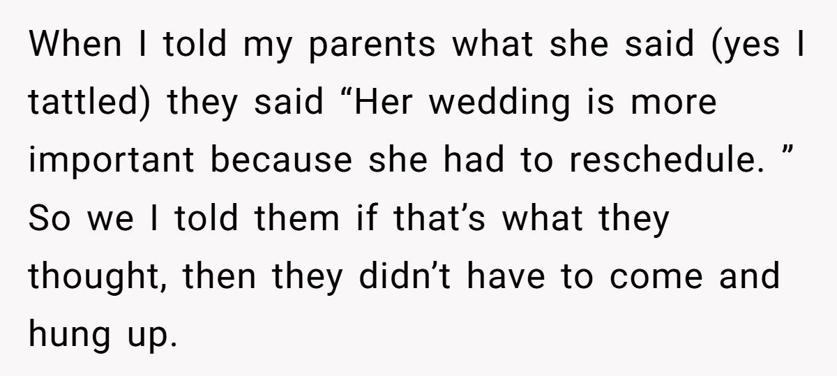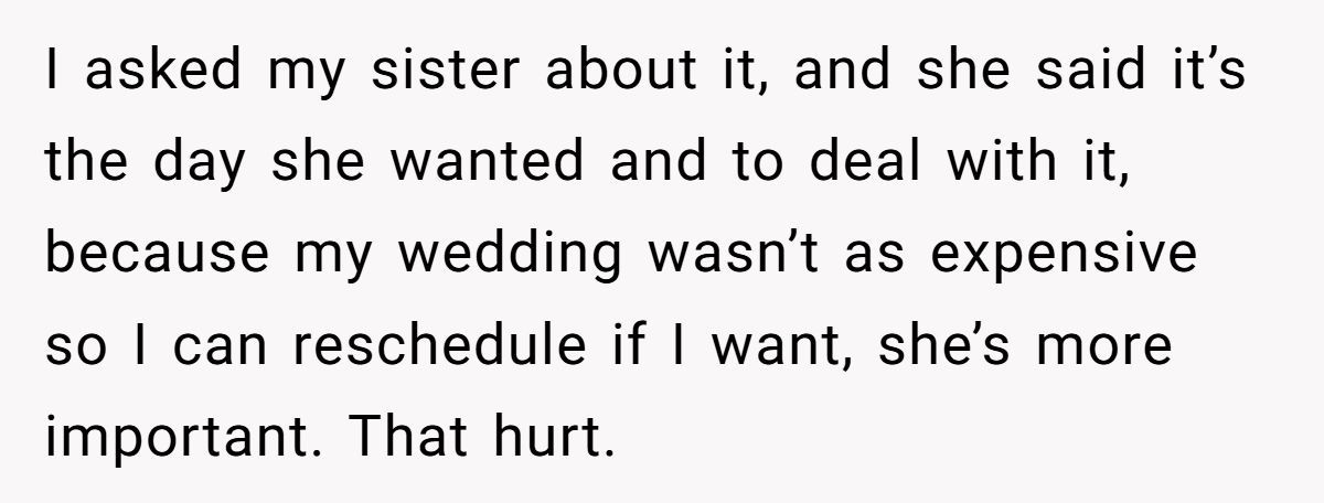 Worse, the sister dismissed their feelings entirely, saying her event mattered more because it cost more and had been planned longer. Their parents backed her up, brushing off their child’s feelings and essentially treating the first wedding as a minor speed bump.