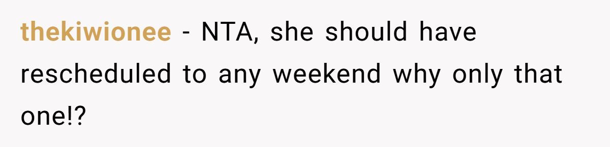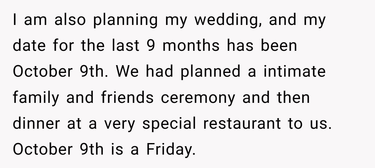 But when your once-in-a-lifetime moment is treated like an afterthought, a strong response feels inevitable. It’s not about the wedding date itself—it’s about being told your milestone doesn’t matter as much.