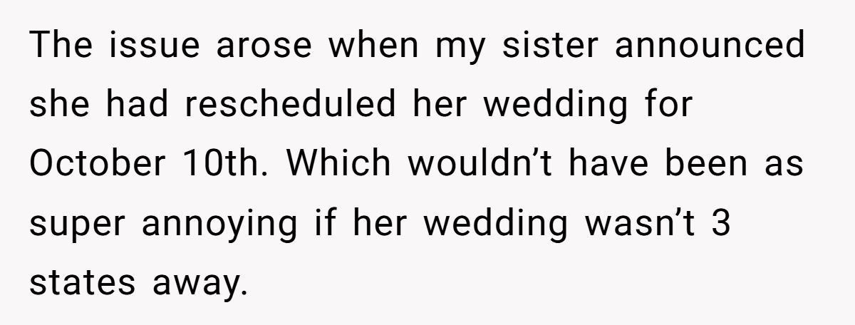 Wedding planning is no small task, but it becomes a whole new battlefield when family favoritism and sibling competition enter the mix. The Redditor had locked in their October 9th wedding and shared the news with excitement. When their sister decided to rebook her delayed wedding for October 10th—and expected everyone to pivot—the Redditor’s joy quickly turned into frustration.