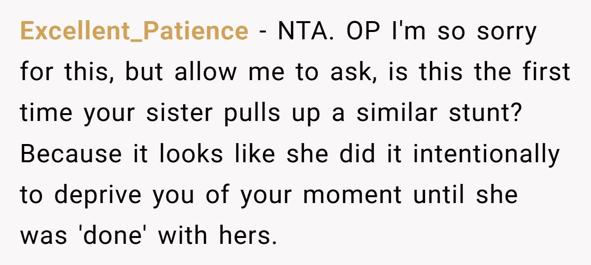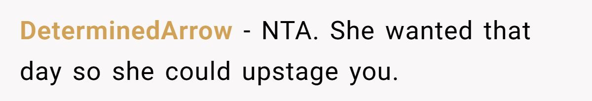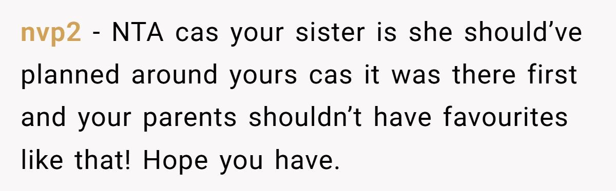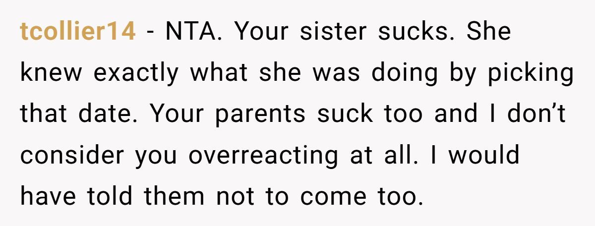 Commenters agreed the original poster wasn’t at fault, criticizing the sister for choosing the date to upstage her and calling out the parents for enabling that behavior.