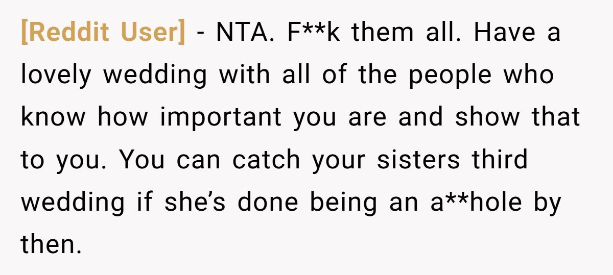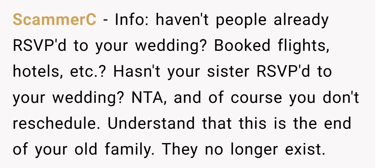 Many Redditors sided with the original poster, emphasizing that the sister’s timing was disrespectful and that the wedding plans shouldn’t be changed.