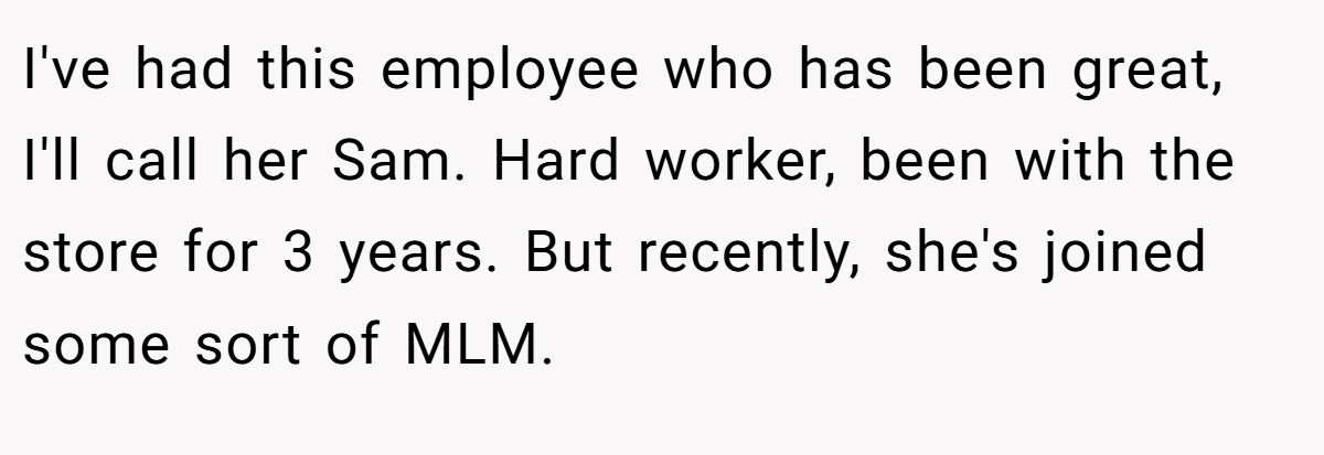 Max’s story is a masterclass in navigating the murky waters of workplace rules and MLM enthusiasm. Sam was a stellar employee, but her obsession with selling essential oils during shifts turned her into a walking infomercial. After three warnings and no change, Max and his boss pulled the plug. But with coworkers calling him out, was Max’s decision a fair boundary or a harsh overreach? Let’s unpack this cart.