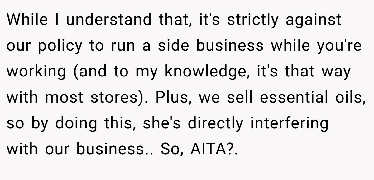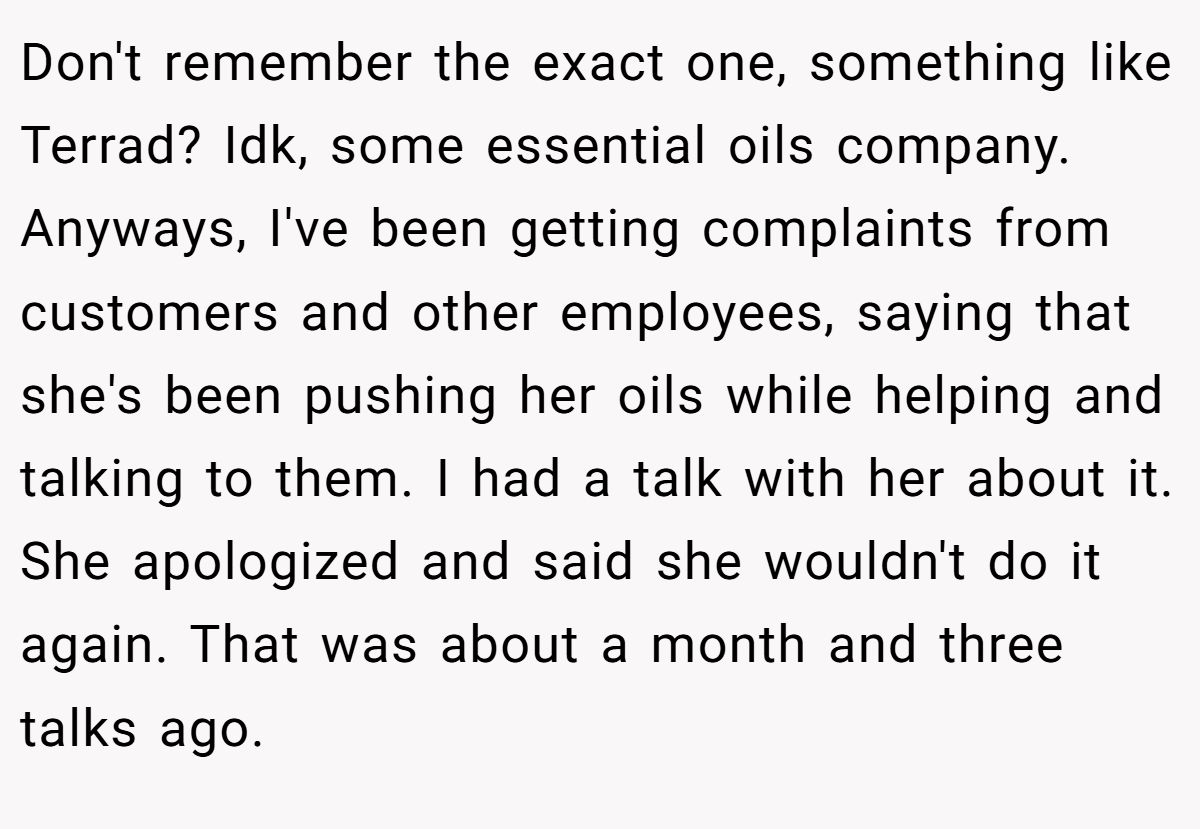 Max’s frustration is relatable, nobody wants their store turned into an MLM pitch fest. Sam’s oil-pushing wasn’t just annoying; it broke explicit company rules against side businesses on the clock. Plus, since the store sells essential oils, her hustle was stepping on their toes, potentially costing sales.