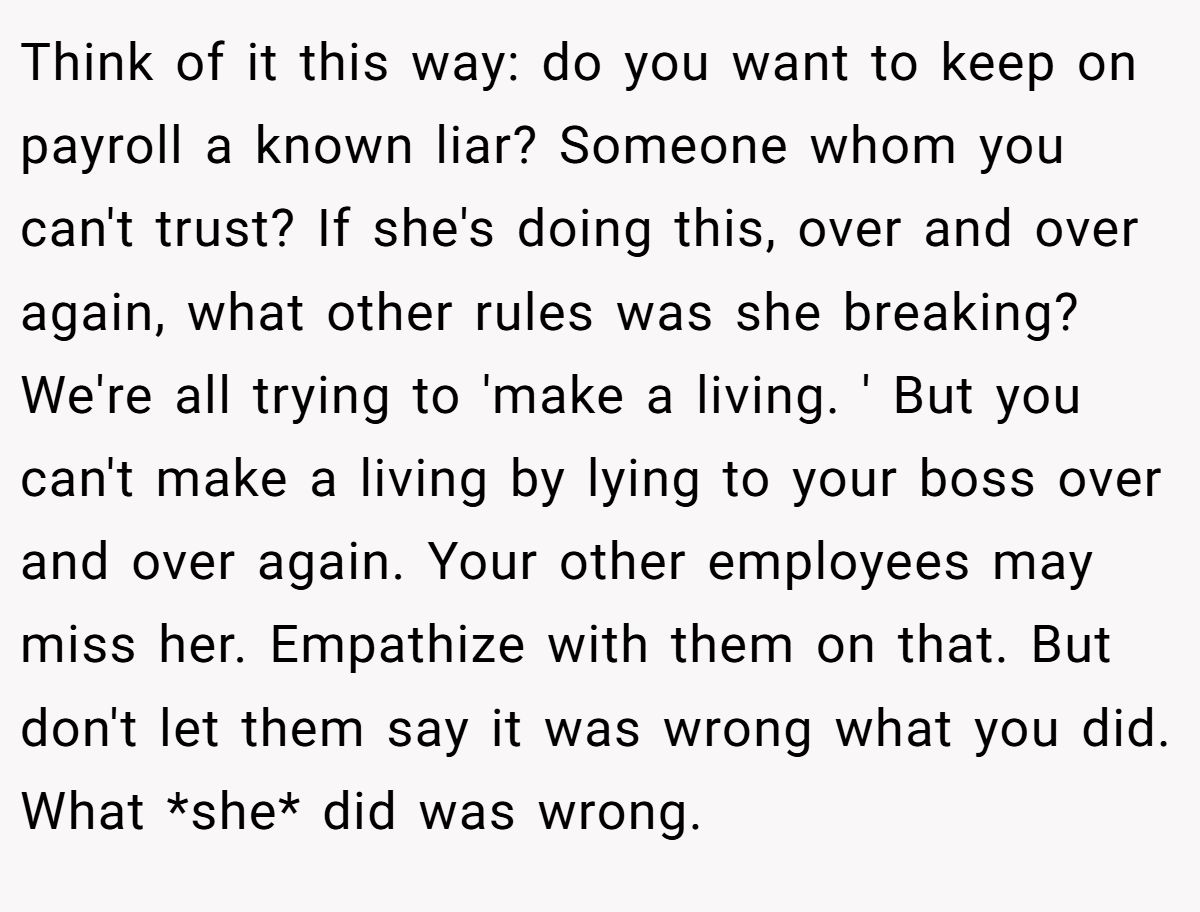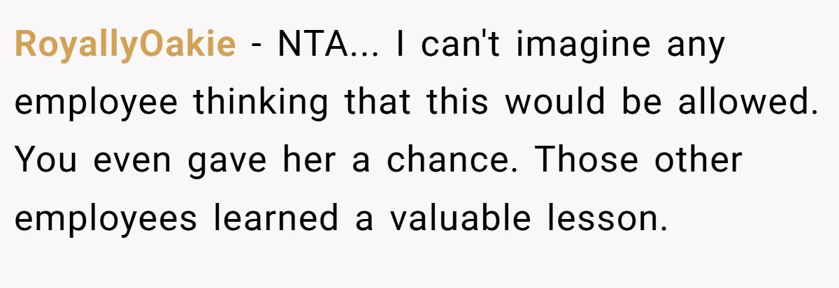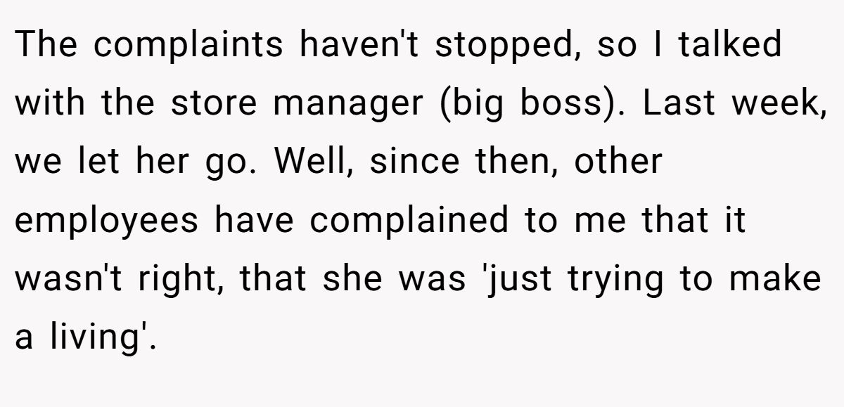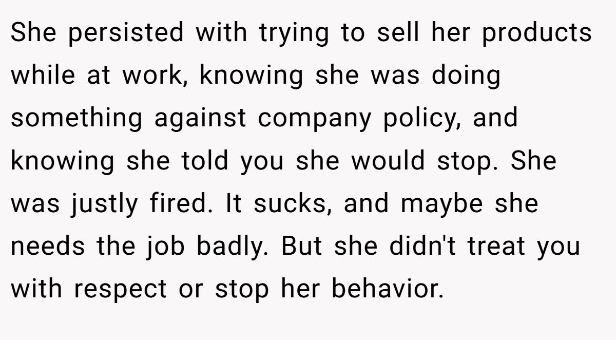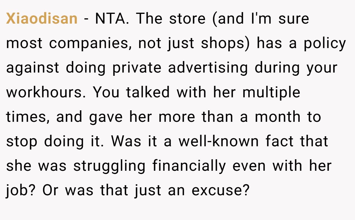 Max’s call aligns here: Sam’s side gig disrupted the store’s vibe and bottom line.What could’ve been done? Max gave Sam multiple chances, but a formal write-up before firing might’ve shown tougher love while covering his bases. For Sam, respecting the workplace boundary, or selling oils outside work, could’ve saved her job. If you were Max, would you have given her one more shot? Let’s hear your take!