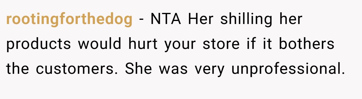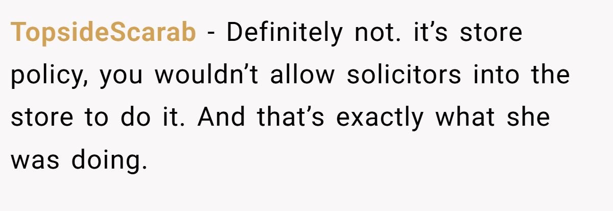 TopsideScarab didn’t mince words, saying this wasn’t just a bad call, it was a clear violation of store policy. Comparing Sam’s behavior to letting outside solicitors walk in and pitch products, they argued Max had every right to shut it down.