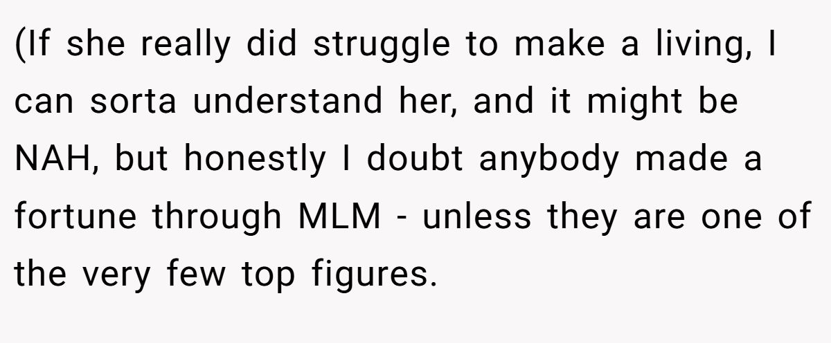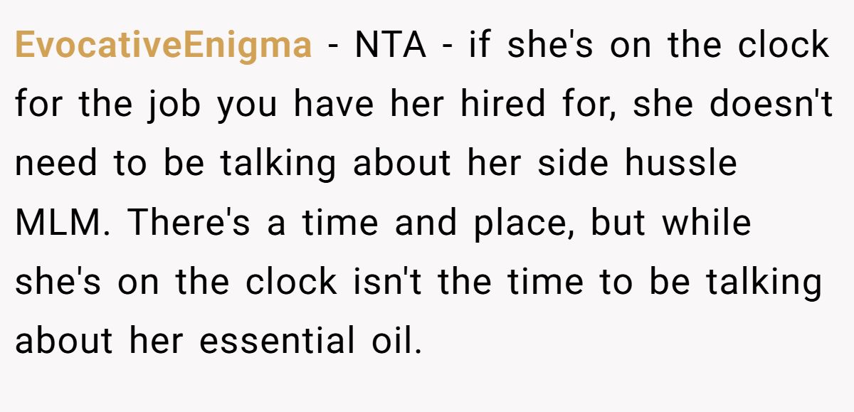 EvocativeEnigma kept it blunt, saying if Sam was on the clock, she should’ve been doing her actual job, not pushing her MLM. There’s a time and place for side hustles, they argued, but chatting about essential oils during work hours definitely wasn’t it.