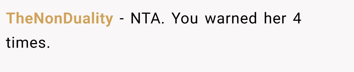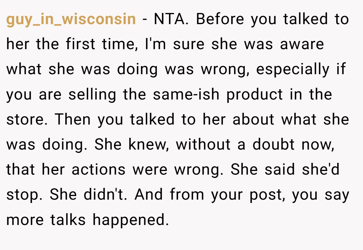 guy_in_wisconsin laid it all out like a closing argument—firm, detailed, and impossible to ignore. He pointed out that even before Max said a word, Sam likely knew her actions were out of line, especially since the store sold similar products. And after being told clearly to stop? She agreed, then kept doing it anyway.