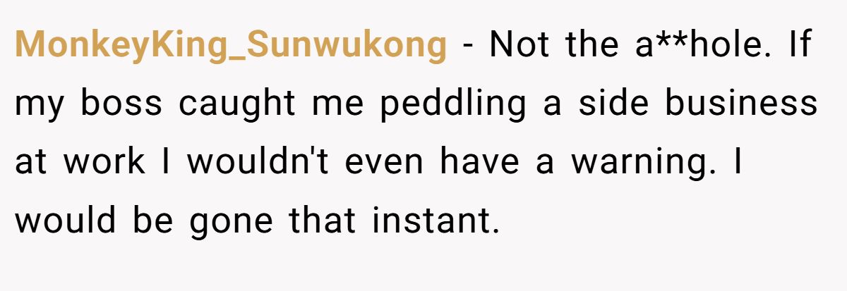 MonkeyKing_Sunwukong didn’t sugarcoat it, saying that in most workplaces, peddling a side hustle on company time wouldn’t earn you a warning, it’d get you fired on the spot. In their eyes, Max was more than fair.
