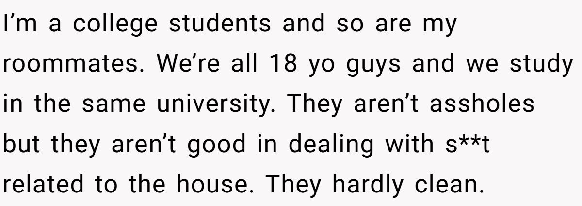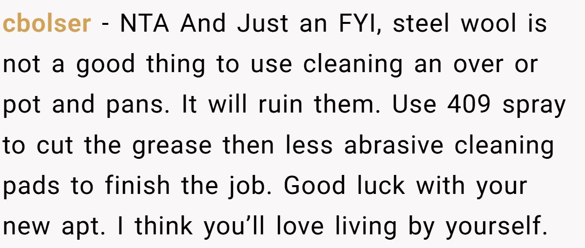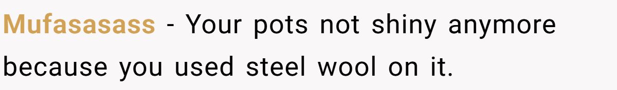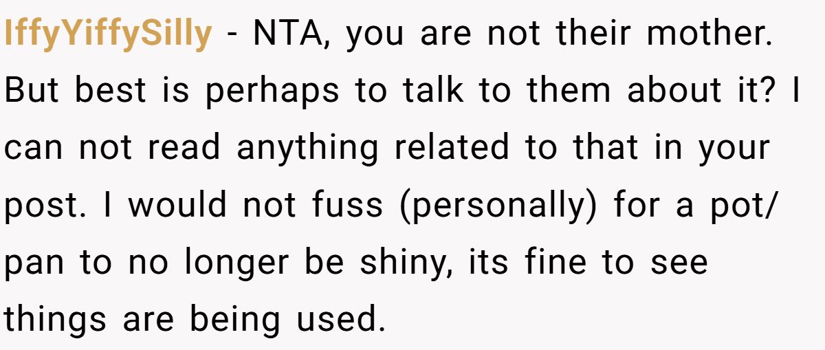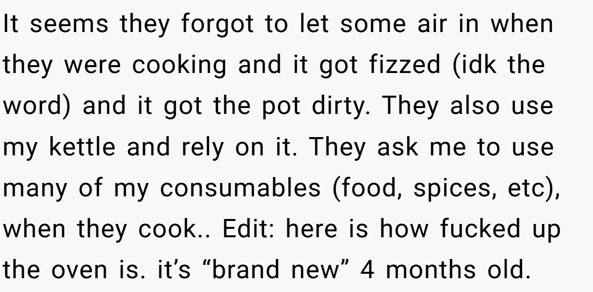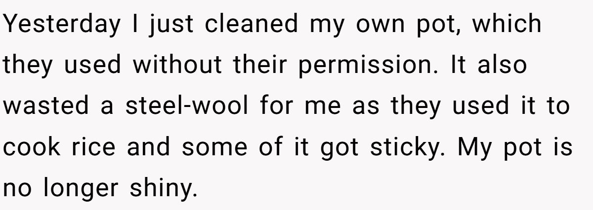The final straw? His own high-quality pot, the one he bought with his hard-earned money, now permanently ruined by one of their late-night “cooking experiments.” Meanwhile, they treat his kettle and spices like shared property, never bothering to ask permission.