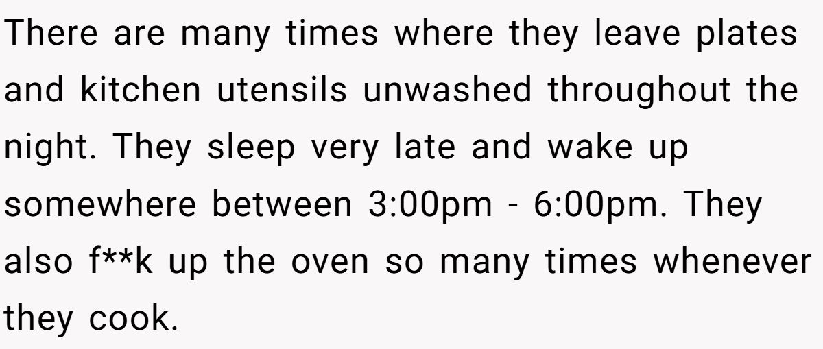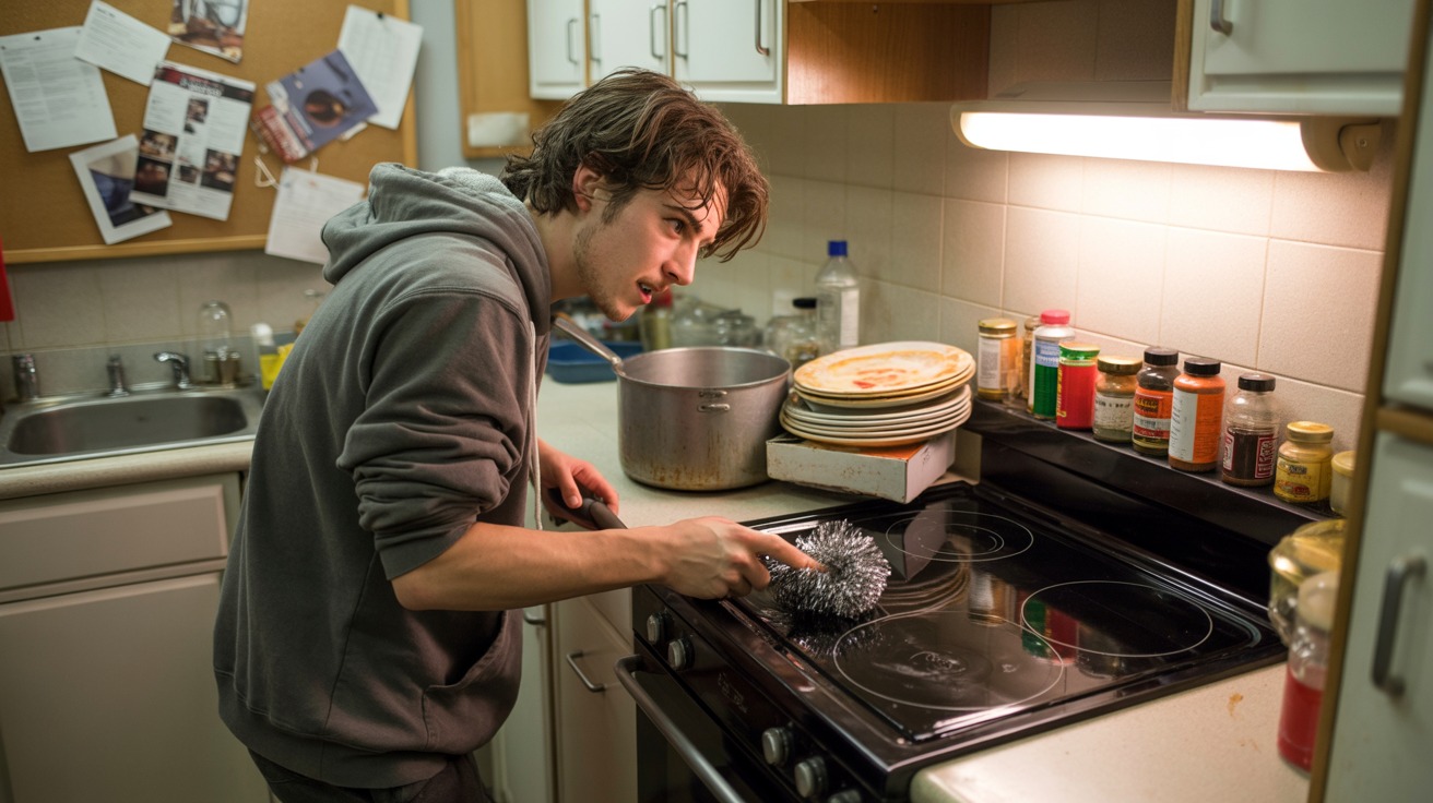 Every day, he’s faced with mountains of crusty dishes left overnight, counters coated in grime, and a once-brand-new oven already blackened by months of neglect. His roommates sleep until noon, cook like toddlers unsupervised, and have zero interest in cleaning up after themselves.