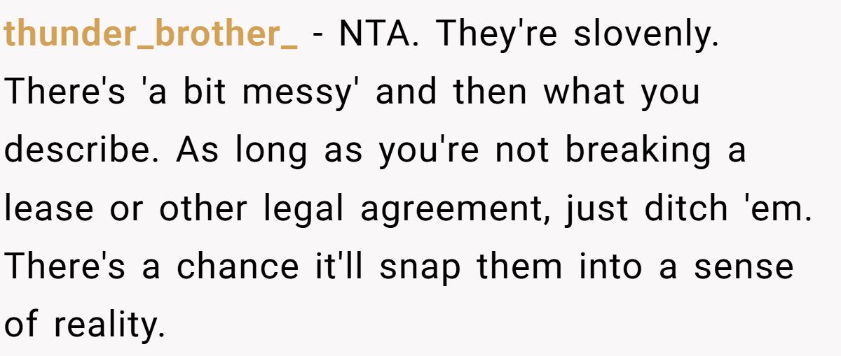 And then there’s the question of boundaries. His roommates have been using his things without asking, wrecking them, and expecting him to foot the bill for their mess. Is that reason enough to cut ties entirely?