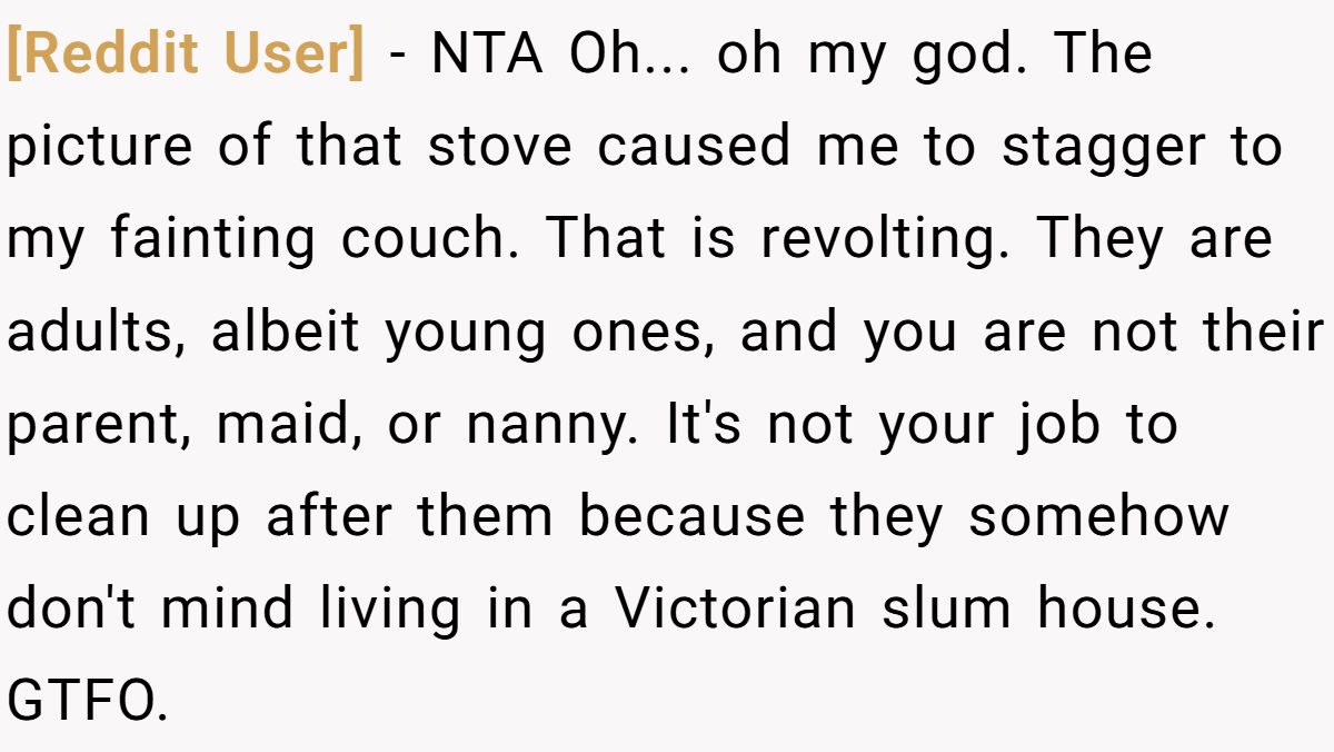![This College Student Cleaned Up After Everyone - Now Wondering If It’s Time to Leave [Reddit User] − NTA Oh... oh my god. The picture of that stove caused me to stagger to my fainting couch. That is revolting. They are adults, albeit young ones, and you are not their parent, maid, or nanny. It's not your job to clean up after them because they somehow don't mind living in a Victorian slum house. GTFO.](https://dailyhighlight.com/wp-content/uploads/2025/07/312412-16.jpg)