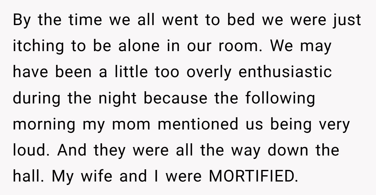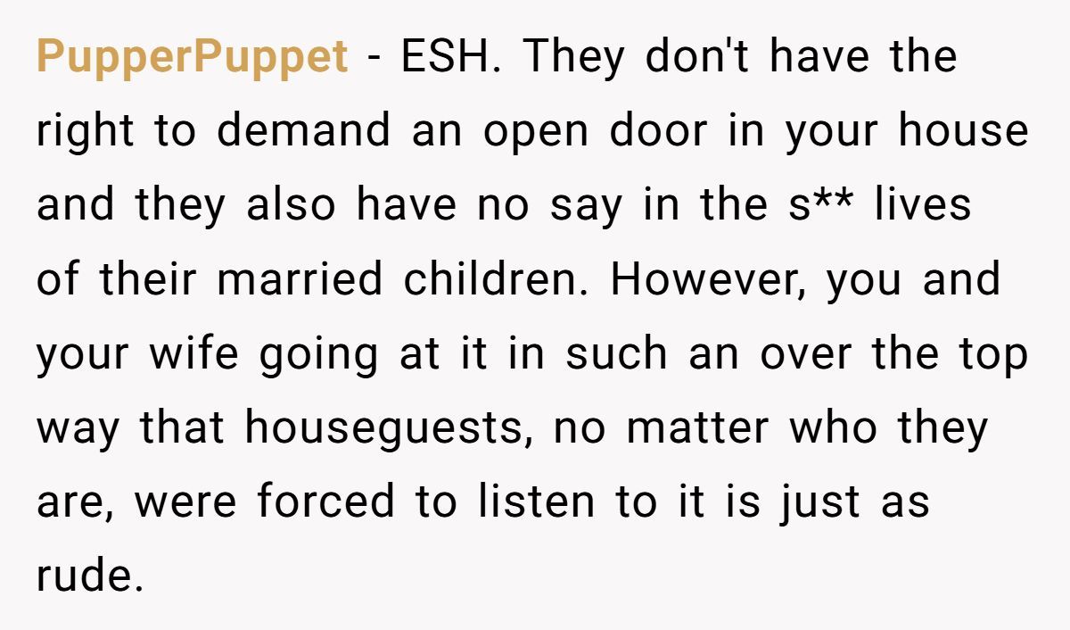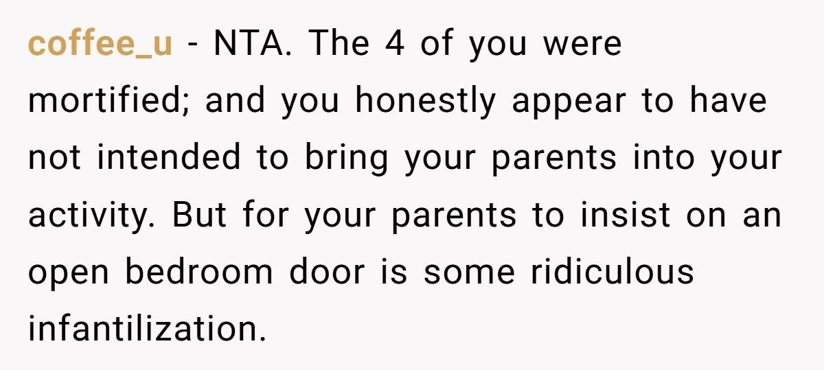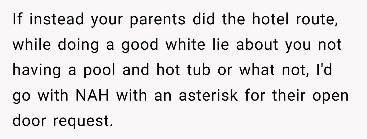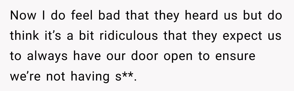 This family mishap might sound like a sitcom episode, but for the couple in question, it was all too real. The Redditor shared the story to get opinions on whether they were wrong for refusing their parents’ open-door rule. According to the post, everything had been going fine during the visit until one wine-fueled night led to some not-so-quiet intimacy. The parents were shocked and uncomfortable. Despite the couple’s apology, they laid down an unusual rule: the bedroom door stays open for the rest of the trip.