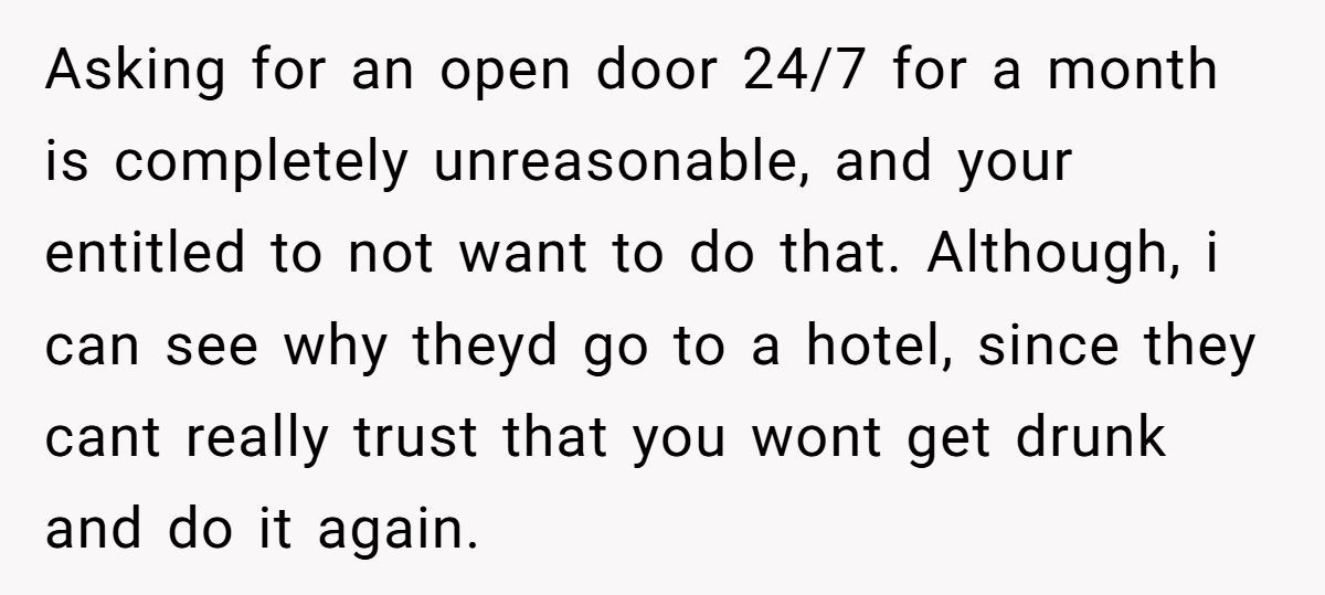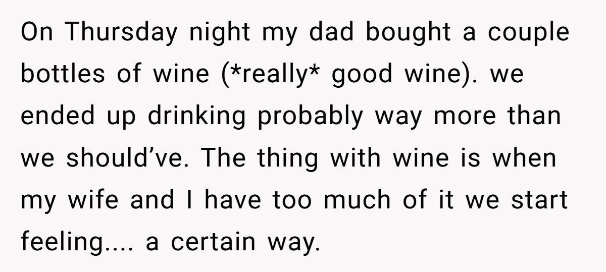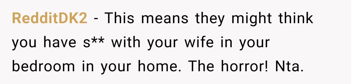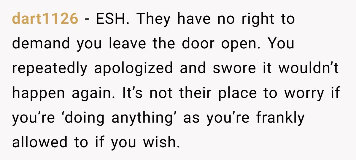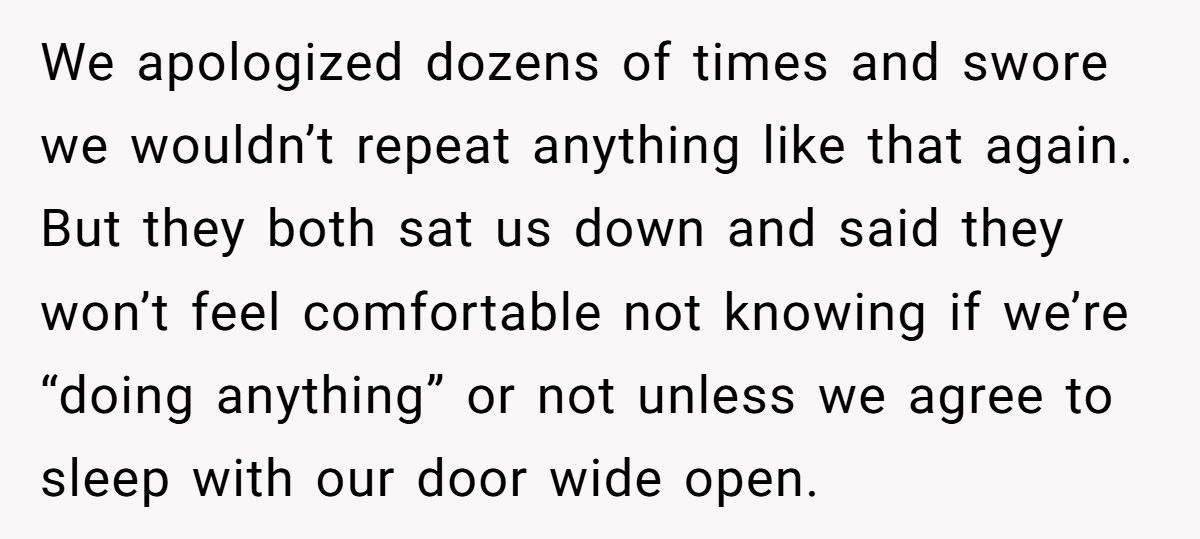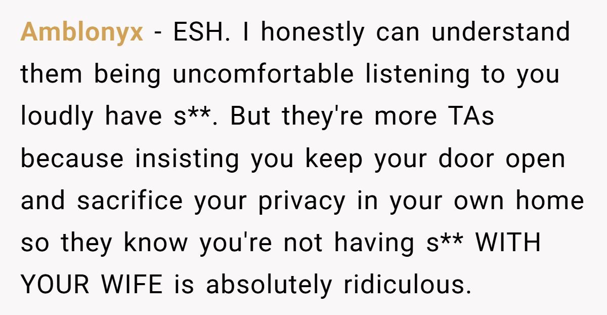 This family mishap might sound like a sitcom episode, but for the couple in question, it was all too real. The Redditor shared the story to get opinions on whether they were wrong for refusing their parents’ open-door rule. According to the post, everything had been going fine during the visit until one wine-fueled night led to some not-so-quiet intimacy. The parents were shocked and uncomfortable. Despite the couple’s apology, they laid down an unusual rule: the bedroom door stays open for the rest of the trip.