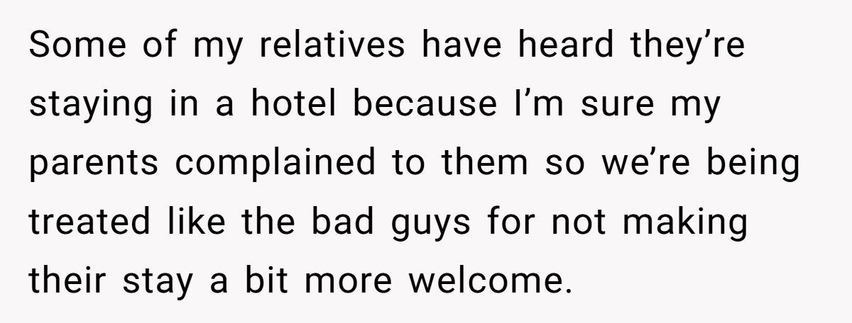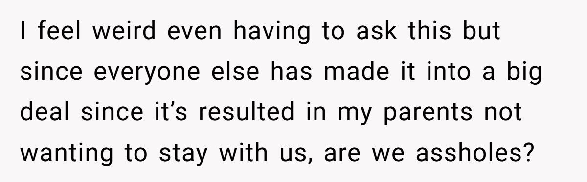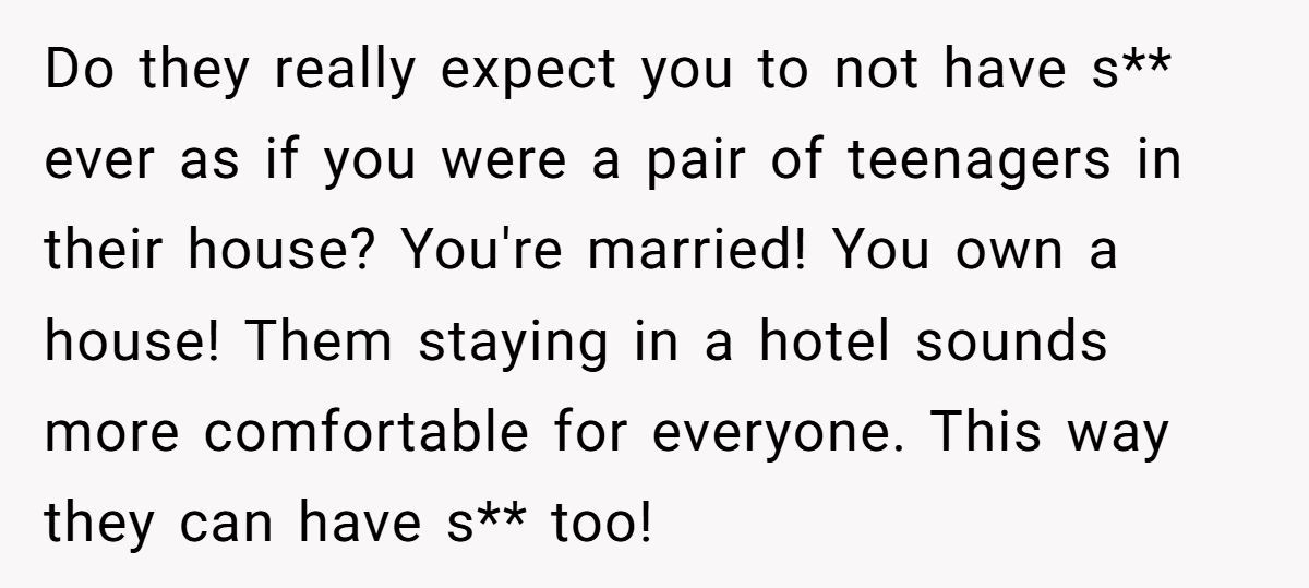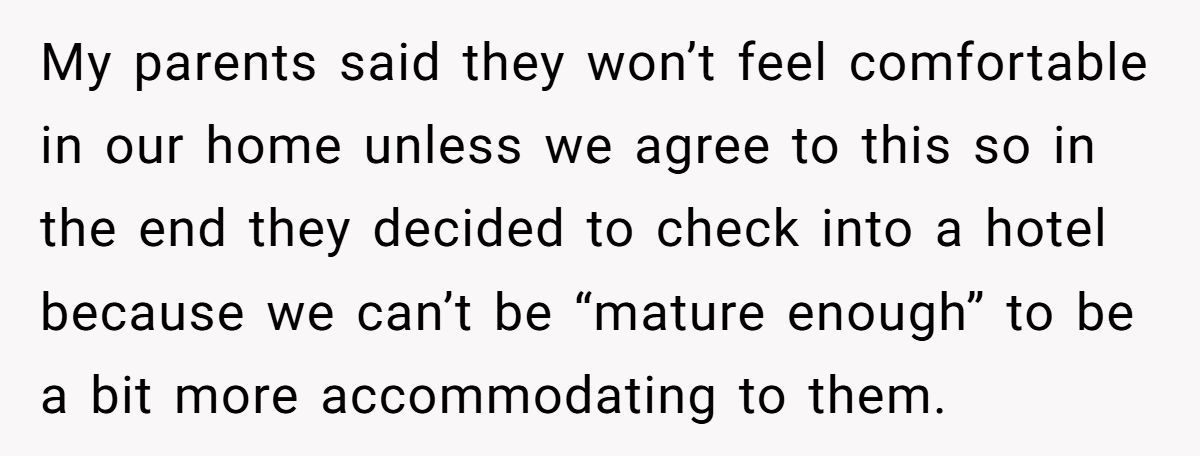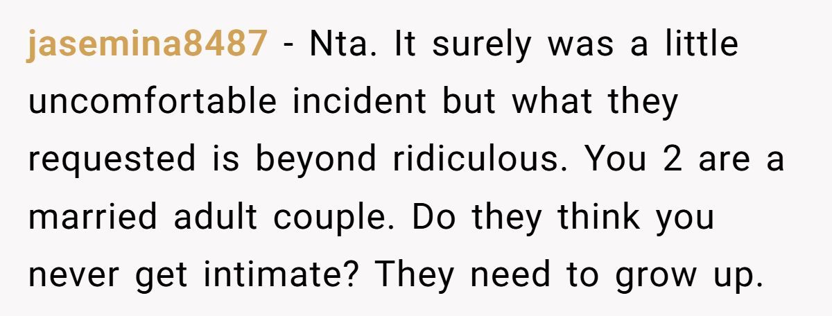 When the couple refused, arguing that their bedroom in their own home should remain private, the parents left. Now the fallout includes relatives blaming the couple for embarrassing their elders and ruining the family stay.