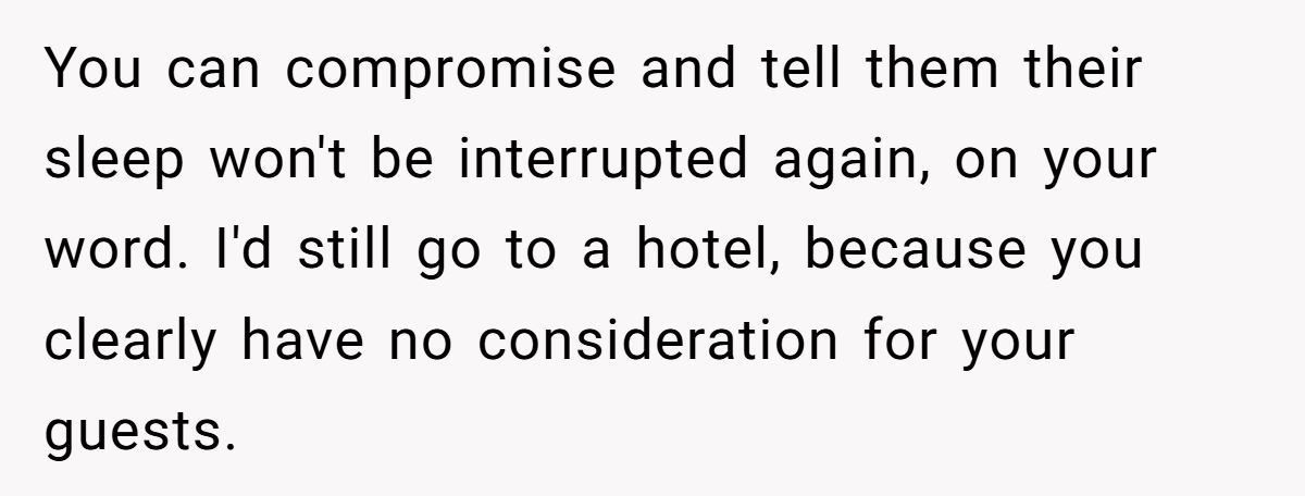Relationship experts agree that this incident touches on much deeper issues than just noise levels. Dr. Rebecca Lang, a therapist specializing in family systems, says situations like this often reflect power dynamics in multigenerational households. “Parents visiting their adult children have to adjust to the fact that they’re guests, not guardians. Expecting control over their children’s home—especially in such personal matters—crosses a line.”