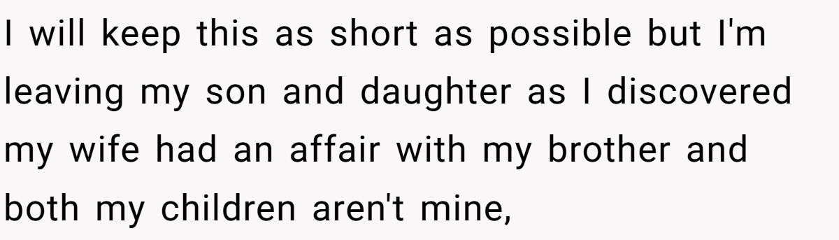I will keep this as short as possible but I'm leaving my son and daughter as I discovered my wife had an affair with my brother and both my children aren't mine,