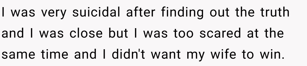 I was very suicidal after finding out the truth and I was close but I was too scared at the same time and I didn't want my wife to win.