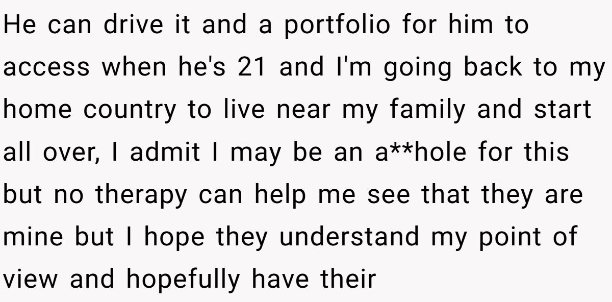 He can drive it and a portfolio for him to access when he's 21 and I'm going back to my home country to live near my family and start all over, I admit I may be an a**hole for this but no therapy can help me see that they are mine but I hope they understand my point of view and hopefully have their
