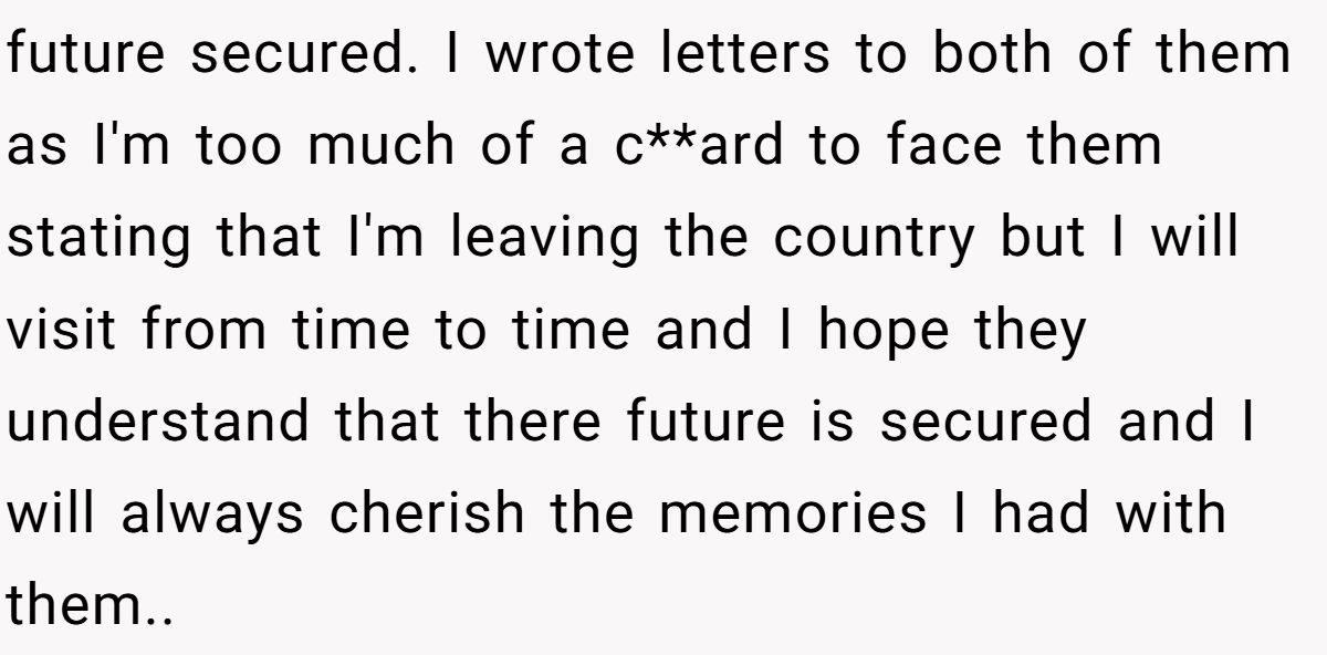 future secured. I wrote letters to both of them as I'm too much of a c**ard to face them stating that I'm leaving the country but I will visit from time to time and I hope they understand that there future is secured and I will always cherish the memories I had with them..