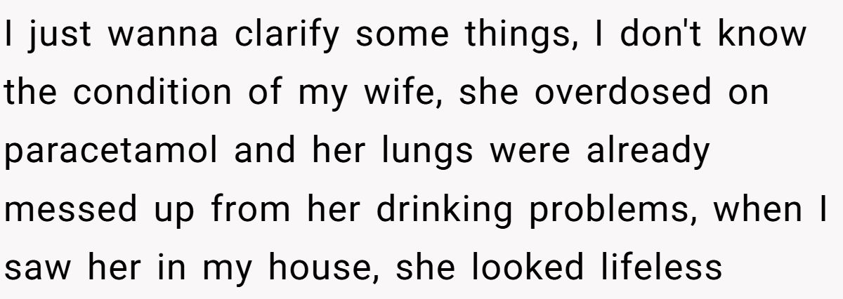 I just wanna clarify some things, I don't know the condition of my wife, she overdosed on paracetamol and her lungs were already messed up from her drinking problems, when I saw her in my house, she looked lifeless