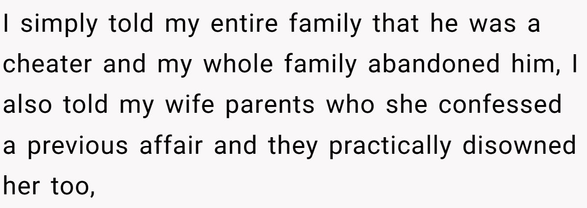 I simply told my entire family that he was a cheater and my whole family abandoned him, I also told my wife parents who she confessed a previous affair and they practically disowned her too,