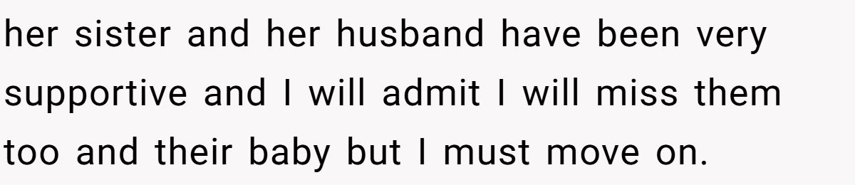 her sister and her husband have been very supportive and I will admit I will miss them too and their baby but I must move on.