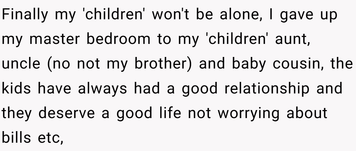 Finally my 'children' won't be alone, I gave up my master bedroom to my 'children' aunt, uncle (no not my brother) and baby cousin, the kids have always had a good relationship and they deserve a good life not worrying about bills etc,