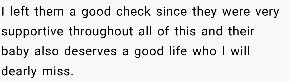 I left them a good check since they were very supportive throughout all of this and their baby also deserves a good life who I will dearly miss.