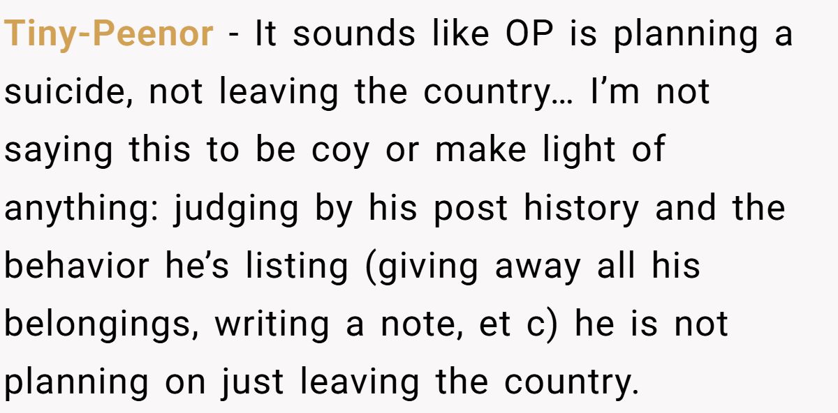 Tiny-Peenor − It sounds like OP is planning a suicide, not leaving the country… I’m not saying this to be coy or make light of anything: judging by his post history and the behavior he’s listing (giving away all his belongings, writing a note, et c) he is not planning on just leaving the country.