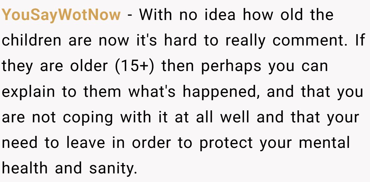 YouSayWotNow − With no idea how old the children are now it's hard to really comment. If they are older (15+) then perhaps you can explain to them what's happened, and that you are not coping with it at all well and that your need to leave in order to protect your mental health and sanity.