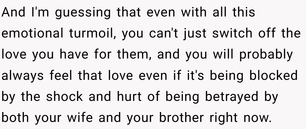 And I'm guessing that even with all this emotional turmoil, you can't just switch off the love you have for them, and you will probably always feel that love even if it's being blocked by the shock and hurt of being betrayed by both your wife and your brother right now.