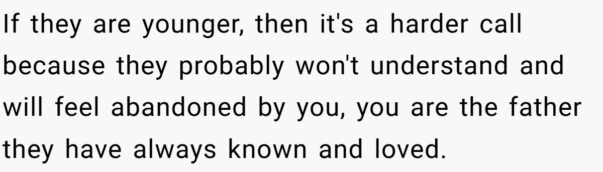 If they are younger, then it's a harder call because they probably won't understand and will feel abandoned by you, you are the father they have always known and loved.
