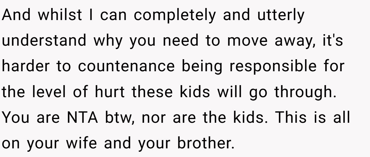 And whilst I can completely and utterly understand why you need to move away, it's harder to countenance being responsible for the level of hurt these kids will go through. You are NTA btw, nor are the kids. This is all on your wife and your brother.