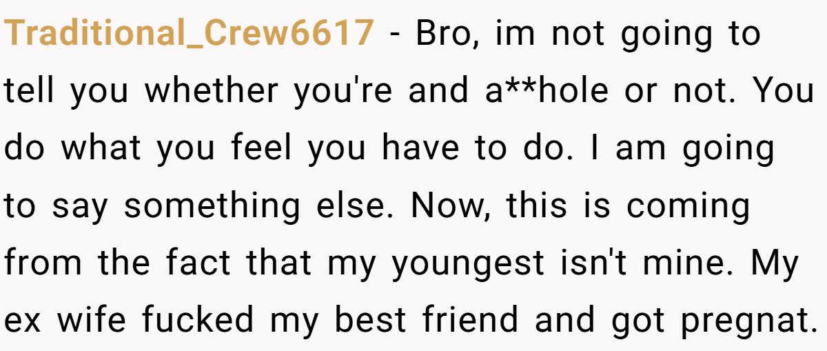 Traditional_Crew6617 − Bro, im not going to tell you whether you're and a**hole or not. You do what you feel you have to do. I am going to say something else. Now, this is coming from the fact that my youngest isn't mine. My ex wife fucked my best friend and got pregnat.