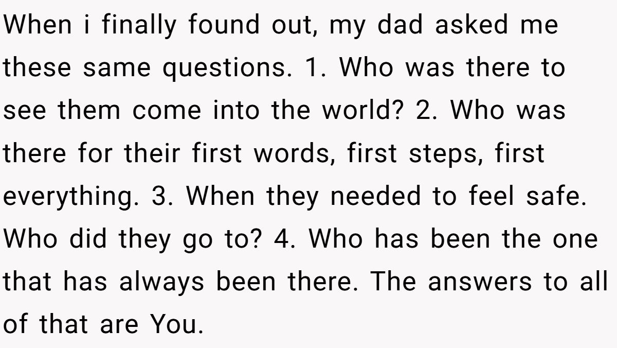 When i finally found out, my dad asked me these same questions. 1. Who was there to see them come into the world? 2. Who was there for their first words, first steps, first everything. 3. When they needed to feel safe. Who did they go to? 4. Who has been the one that has always been there. The answers to all of that are You.