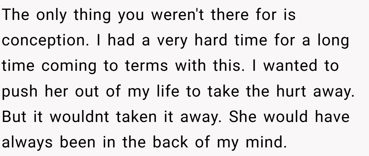 The only thing you weren't there for is conception. I had a very hard time for a long time coming to terms with this. I wanted to push her out of my life to take the hurt away. But it wouldnt taken it away. She would have always been in the back of my mind.