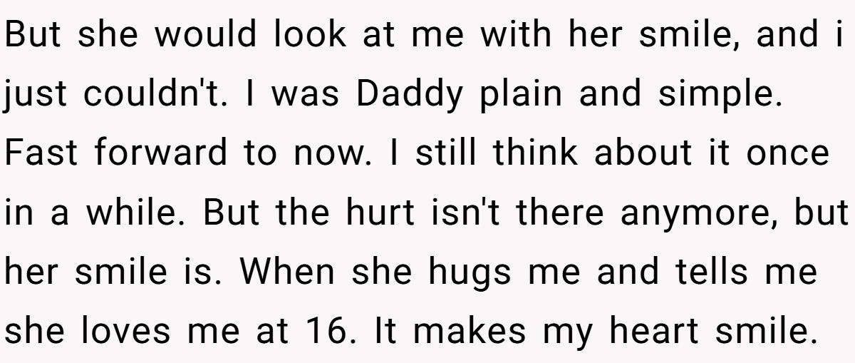 But she would look at me with her smile, and i just couldn't. I was Daddy plain and simple. Fast forward to now. I still think about it once in a while. But the hurt isn't there anymore, but her smile is. When she hugs me and tells me she loves me at 16. It makes my heart smile.