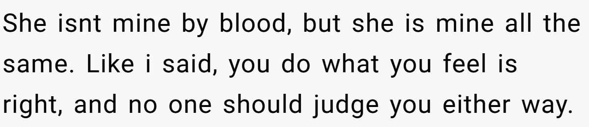 She isnt mine by blood, but she is mine all the same. Like i said, you do what you feel is right, and no one should judge you either way.