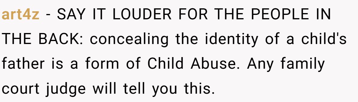 art4z − SAY IT LOUDER FOR THE PEOPLE IN THE BACK: concealing the identity of a child's father is a form of Child Abuse. Any family court judge will tell you this.