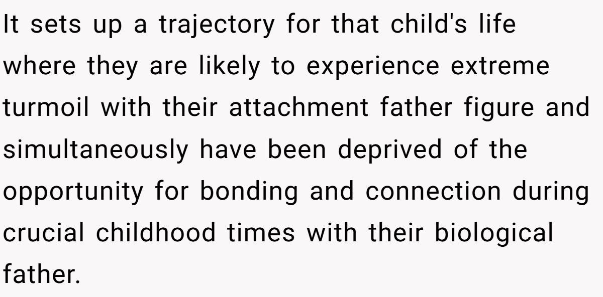 It sets up a trajectory for that child's life where they are likely to experience extreme turmoil with their attachment father figure and simultaneously have been deprived of the opportunity for bonding and connection during crucial childhood times with their biological father.