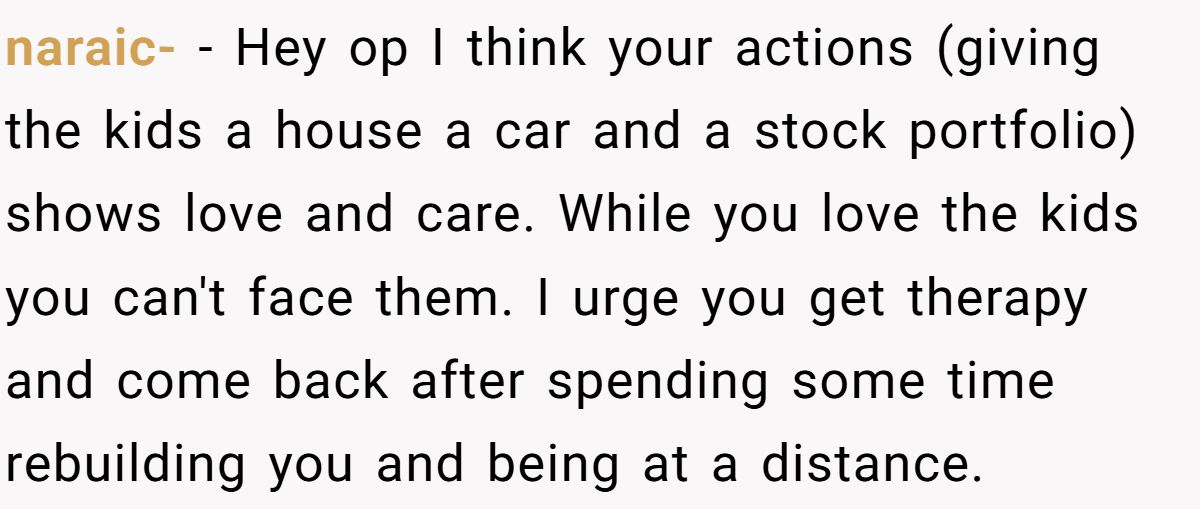 naraic- − Hey op I think your actions (giving the kids a house a car and a stock portfolio) shows love and care. While you love the kids you can't face them. I urge you get therapy and come back after spending some time rebuilding you and being at a distance.