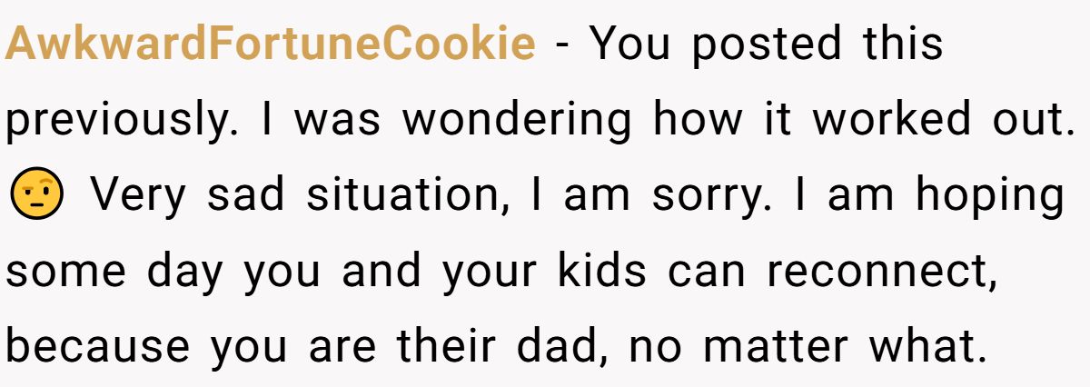 AwkwardFortuneCookie − You posted this previously. I was wondering how it worked out. 🤨 Very sad situation, I am sorry. I am hoping some day you and your kids can reconnect, because you are their dad, no matter what.