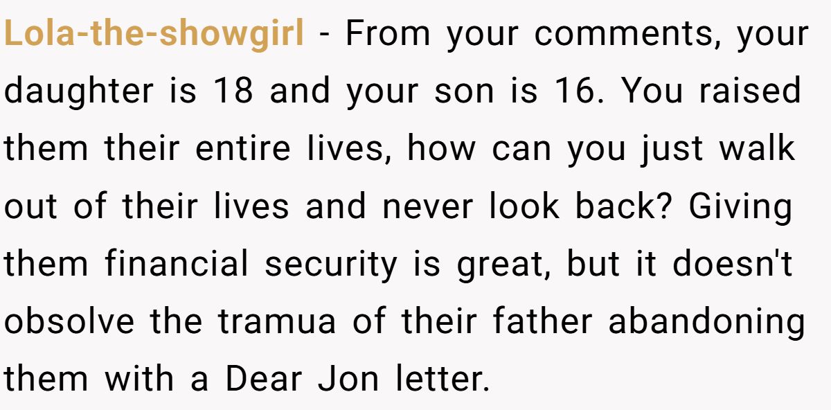 Lola-the-showgirl − From your comments, your daughter is 18 and your son is 16. You raised them their entire Iives, how can you just walk out of their lives and never look back? Giving them financial security is great, but it doesn't obsolve the tramua of their father abandoning them with a Dear Jon letter.