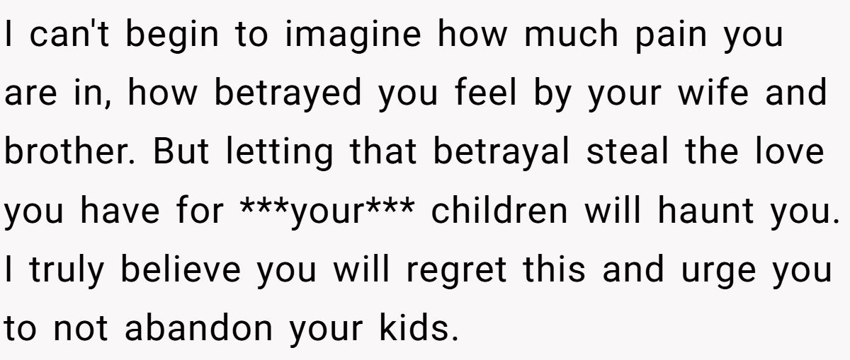 I can't begin to imagine how much pain you are in, how betrayed you feel by your wife and brother. But letting that betrayal steal the love you have for ***your*** children will haunt you. I truly believe you will regret this and urge you to not abandon your kids.