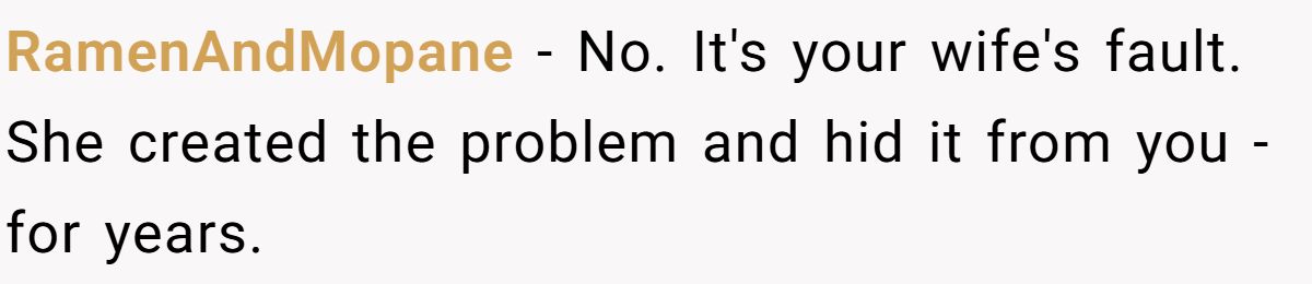 RamenAndMopane − No. It's your wife's fault. She created the problem and hid it from you - for years.