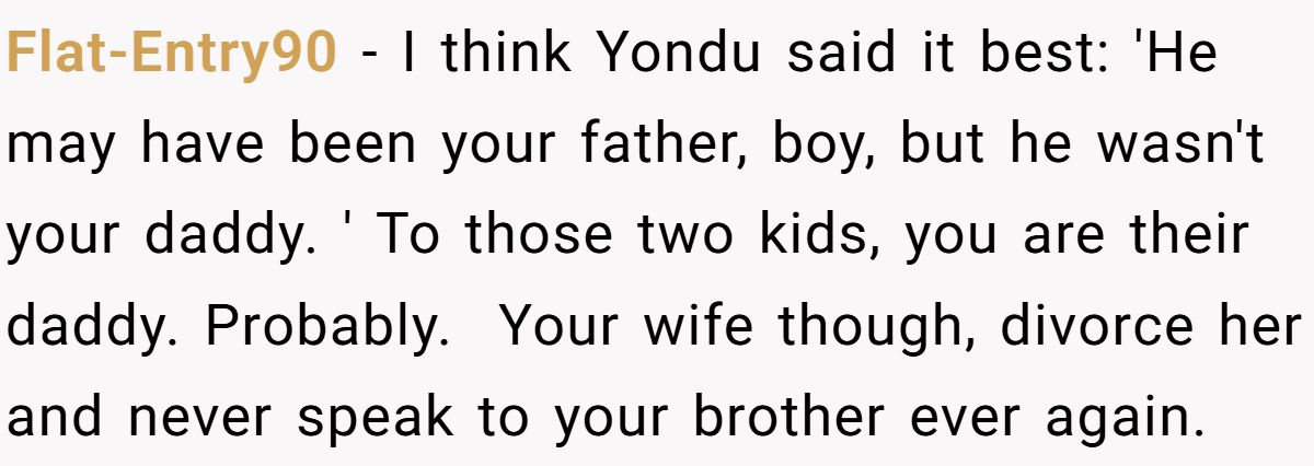 Flat-Entry90 − I think Yondu said it best: 'He may have been your father, boy, but he wasn't your daddy. ' To those two kids, you are their daddy. Probably. ​ Your wife though, divorce her and never speak to your brother ever again.